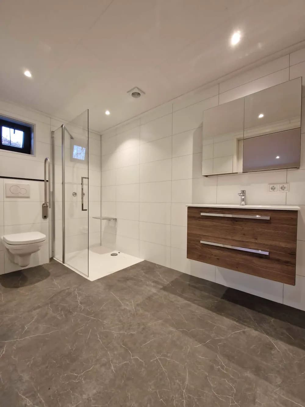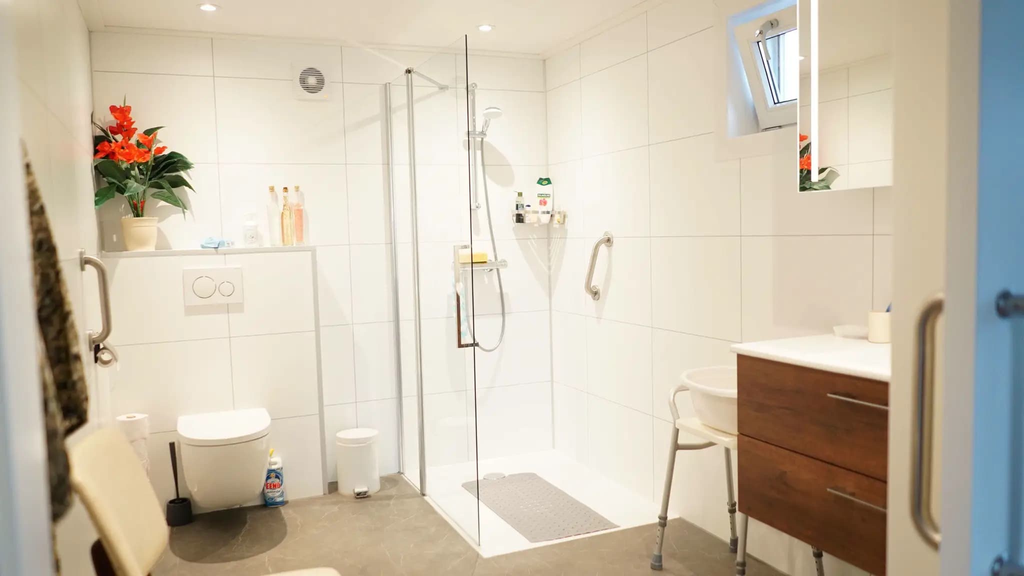 De wanden van onze badkamers zijn gemaakt van Fibo trespo wallpanels. De vloeren hebben een antislip coating, en bestaan uit één geheel, zodat er geen kans is op lekkage tussen de voegen. De doucheruimte in de badkamer is drempelloos, zodat niemand hier over struikelt. Onze doucheschermen zijn 180 graden draaibaar, waardoor de doucheruimte toegankelijk is voor rolstoelen. Het sanitair wordt verhoogd gemonteerd, en er zijn sta-op beugels bij het toilet en de douche. Als laatste is er de mogelijkheid voor een alarm en een zorgwastafel in de badkamer.