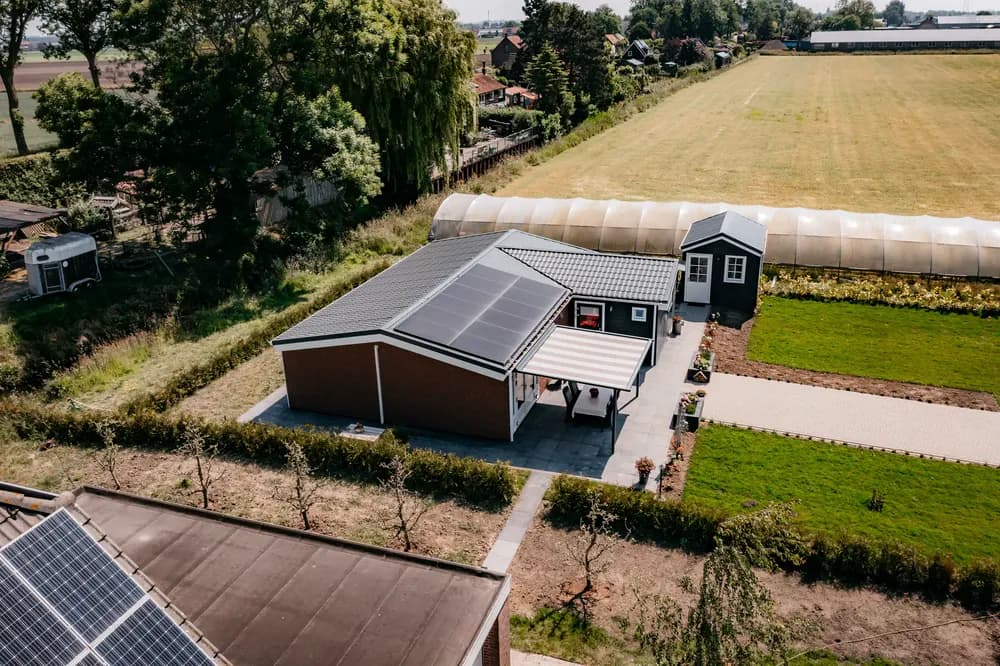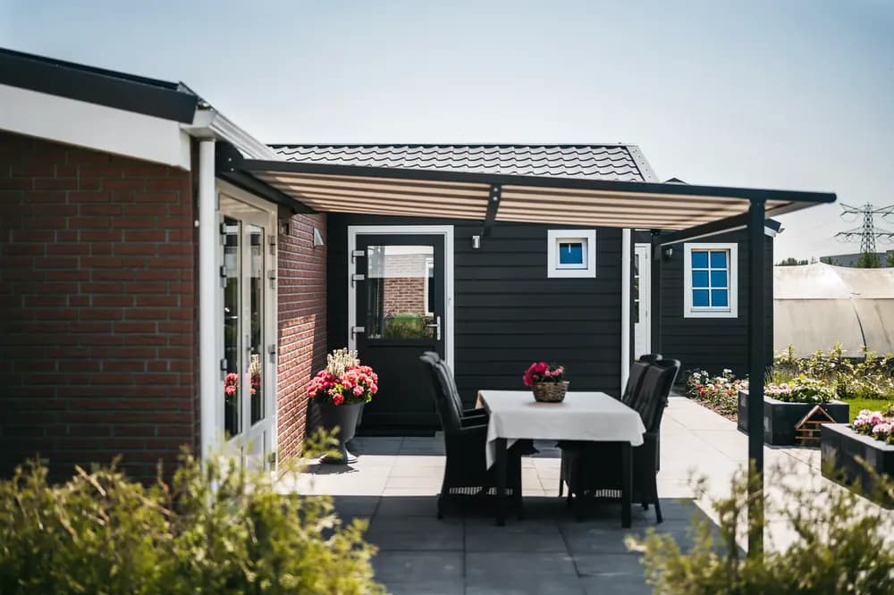 Deze mantelzorgwoning heeft een gevelbekleding gemaakt van steenstrips in combinatie met kunststof antraciet gevelbekleding.